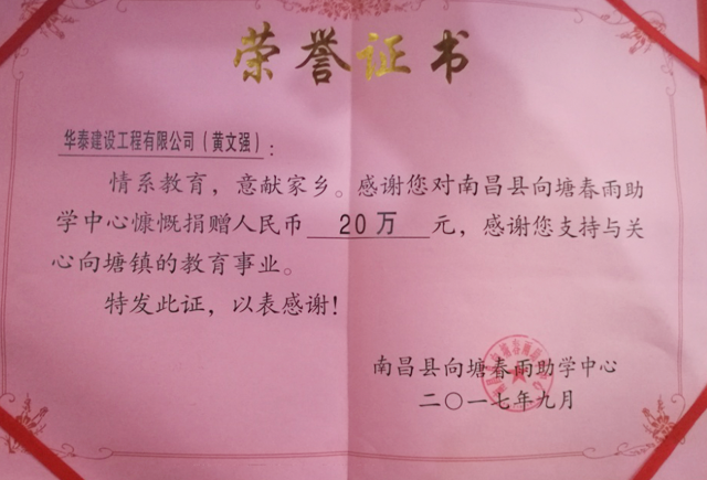 今天我們公司周總代表華泰建設及公司董事長黃總參加向塘春雨助學活動并捐獻愛心。公司在董事長倡議及帶領下,大力弘揚樂善好施的文明行為,積極營造人人關心、人人參與愛心助學行為的良好氛圍,先后參與春雨助學、苗苗助學等愛心活動。