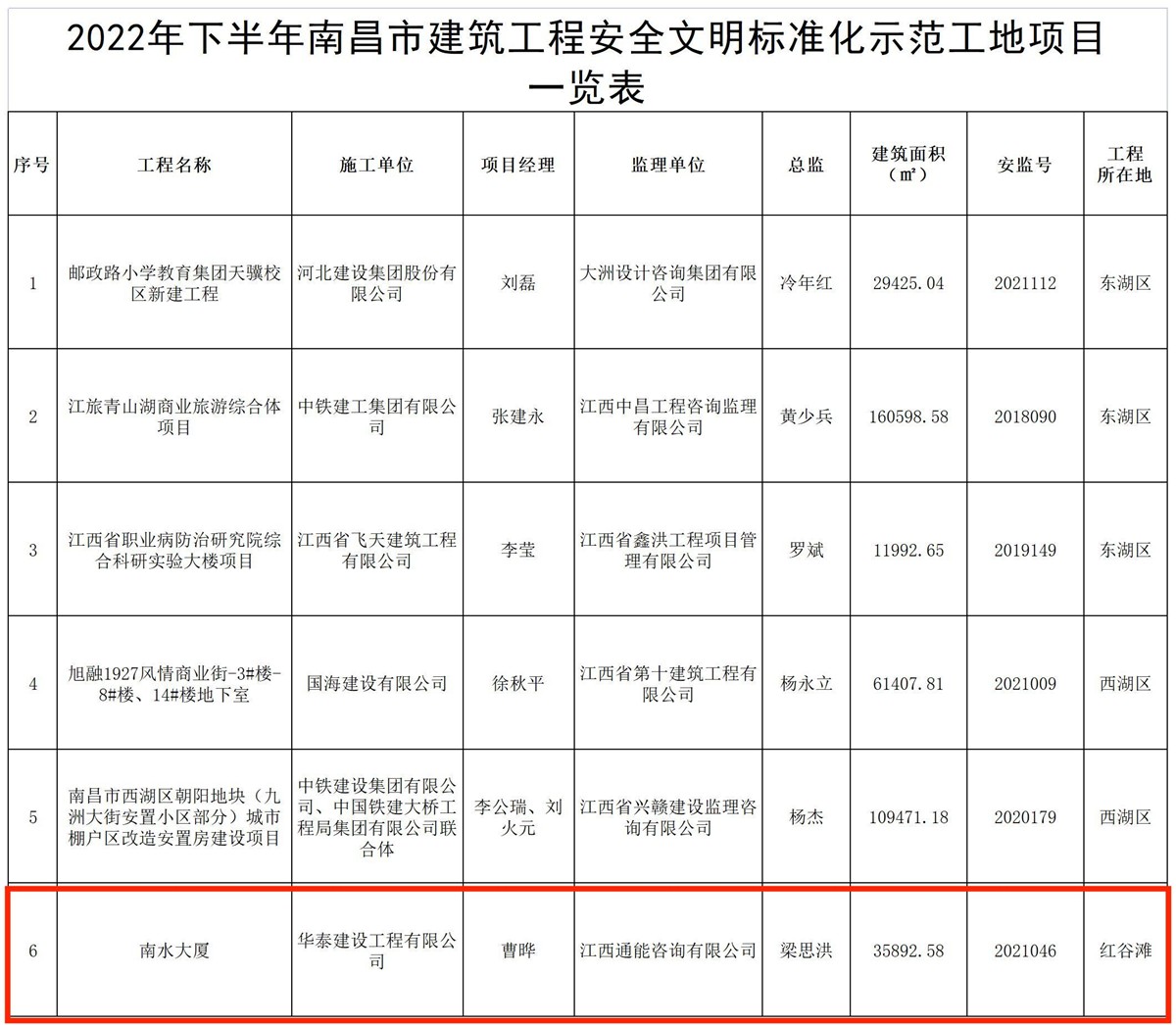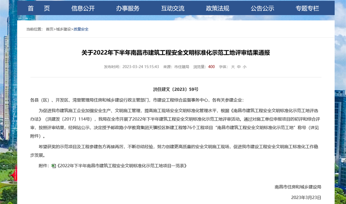 近日,南昌市住房與城鄉建設局公布了2022下半年南昌市建筑工程安全文明標準化示范工地評選結果,華泰建設工程有限公司“南水大廈”項目榜上有名。